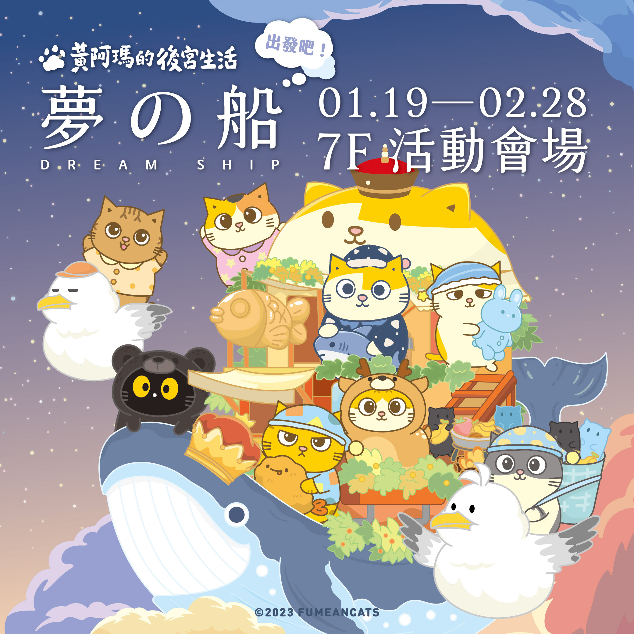 現場以後宮貓咪們乘坐的鯨魚船打卡牆揭開夢之船的故事序幕,船上載著穿著睡衣的後宮貓咪們在夢境裡航行!還設有星星許願牆讓大家留下新年新的願望與夢想!